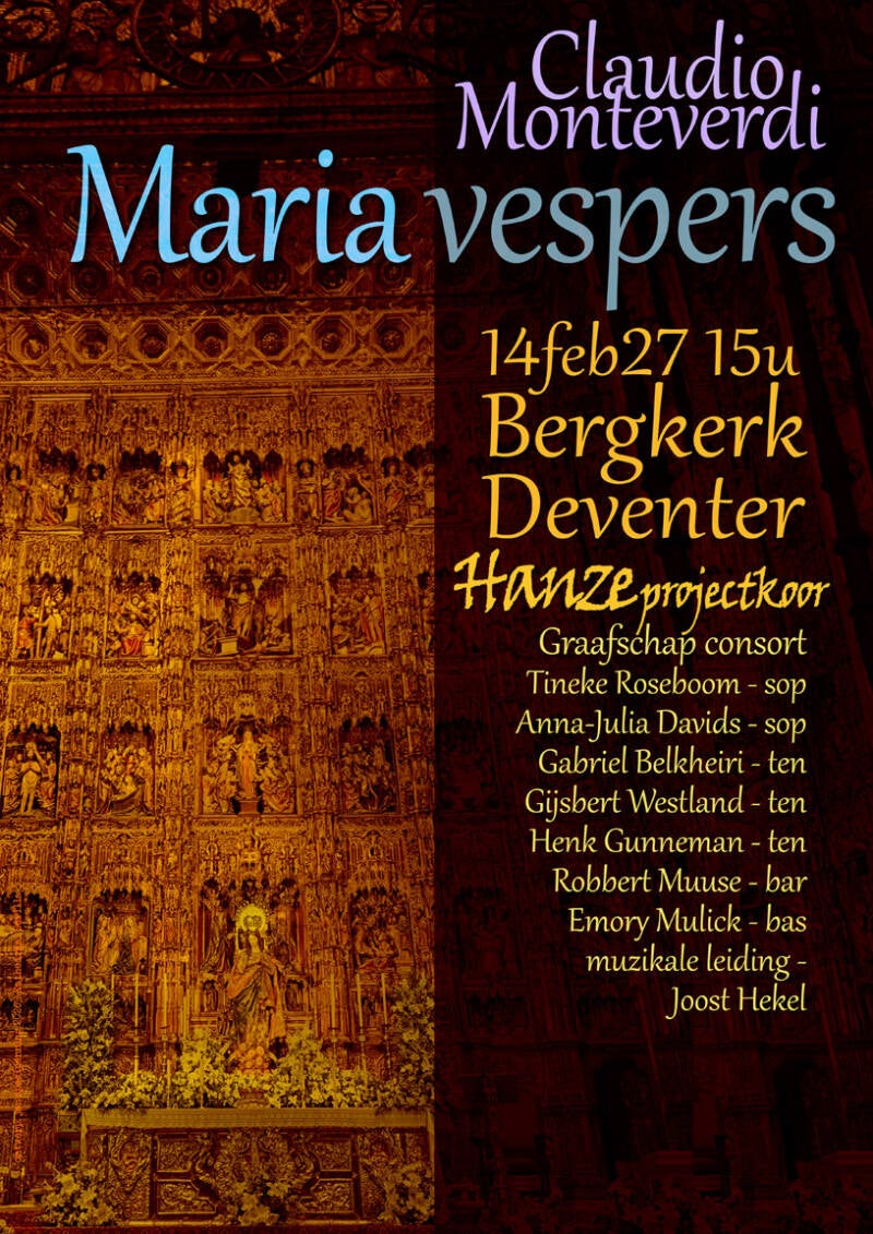 In onze geliefde Bergkerk zal het Hanze Projectkoor de Mariavespers van Monteverdi uitvoeren op zondagmiddag 14 februari 2027 15.00 uur.